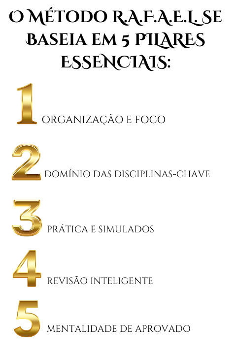 O Método R.A.F.A.E.L. é o treinamento único e exclusivo para quem deseja conquistar a aprovação em concursos policiais de forma estratégica e eficiente. Desenvolvido para candidatos comprometidos e focados, este método foi criado para transformar sua forma de estudar e maximizar seus resultados, levando você até a tão sonhada vaga.